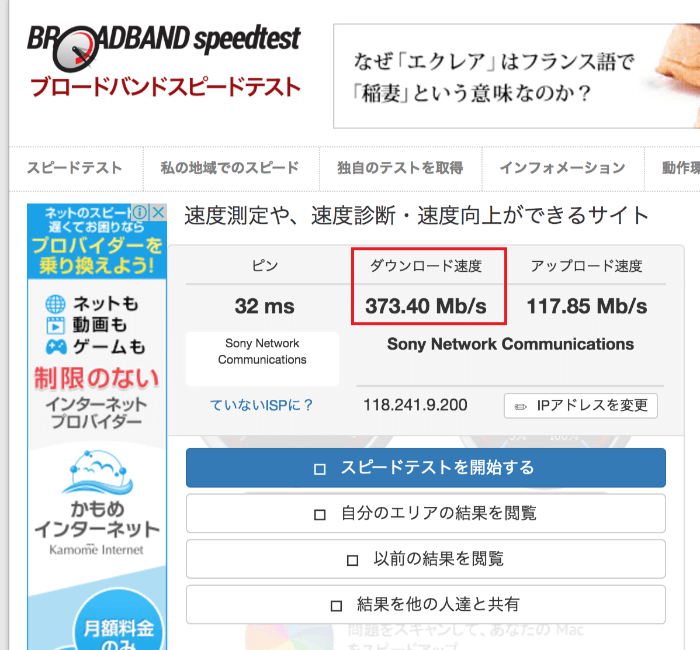 | Broadband speedtest | 58.4Mbps | 348.0Mbps | 6.0倍 |