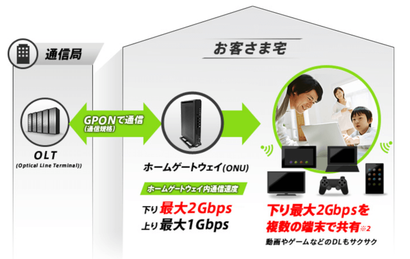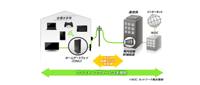 NURO光はNTT東日本が所有している光ファイバーのうち「ダークファイバー」と呼ばれる回線を活用してサービスを提供しています。「ダークファイバー」とは、設置はされているが利用されていない光ファイバーのことです。光回線はNTTのものですが、回線からネットを使うためのホームゲートウェイまでの管理は全てソニーネットワークコミュニケーションズ株式会社が行なっています。