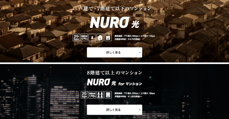 戸建てやマンションタイプが申し込みできない集合住宅用のプランです。NURO光には2年間契約の「NURO光 G2V」と、契約期間の無い「NURO光 G2」があります。それぞれの違いは以下の通りです。