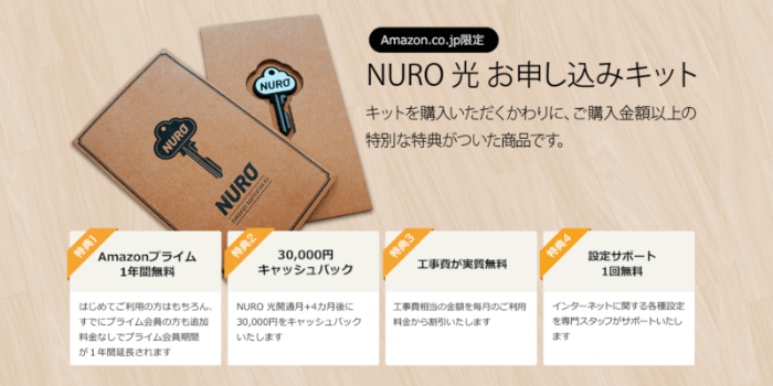Amazonで売っている「NUROキーホルダー」を購入して、キーホルダーに載っているURLからNURO光を申し込みすると以下の特典が受け取れます。