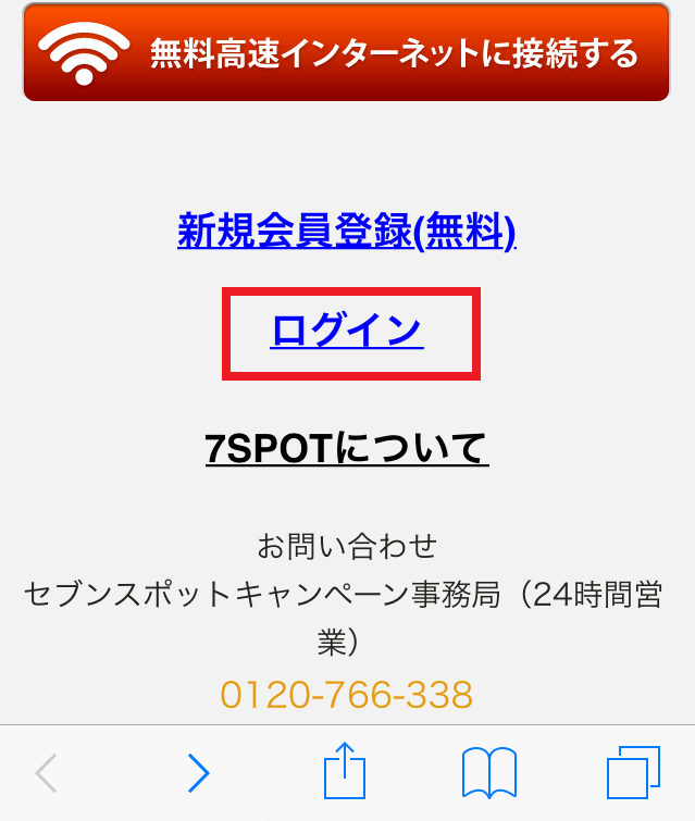2回目以降は、登録は不要です。お店に入るとスマホが自動で「7SPOT」にネットワーク接続されます。「7SPOT」に接続した後は、下記の手順でブラウザからログインすれば簡単にネット接続できます。