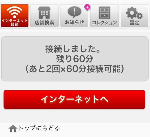 (4)「接続しました。残り60分 (あと2回✕60分接続可能)」という画面が表示されたらネット接続完了です▼