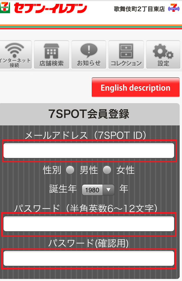 セブンスポットを利用するには、セブンスポットのHPからメールアドレスの登録が必要です。事前に登録可能ですが、お店でも短時間で登録できます。