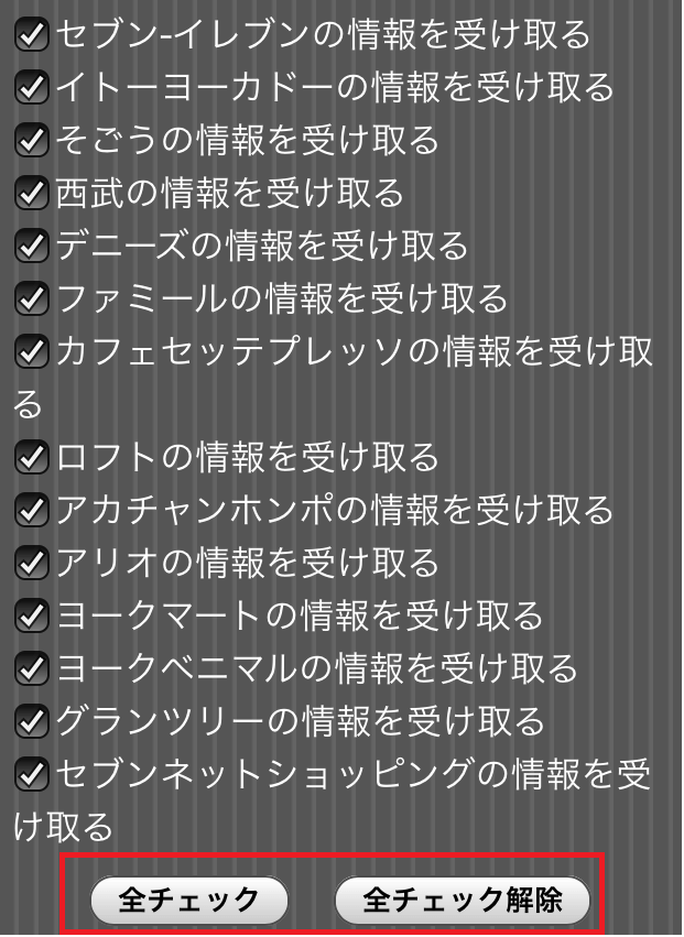 「情報配信設定」では、キャンペーン情報やメルマガの受け取り設定ができます。必要なければ[全チェック解除]をタップしましょう▼