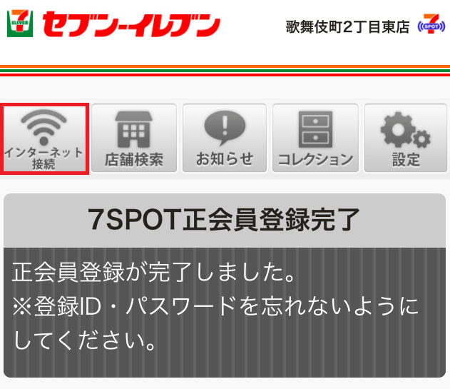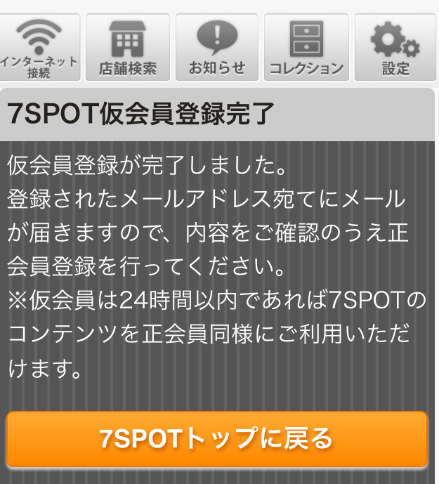 (9)「7SPOT仮会員登録完了」の画面が表示されたら登録は完了です。左上の[インターネット接続]をタップしましょう▼