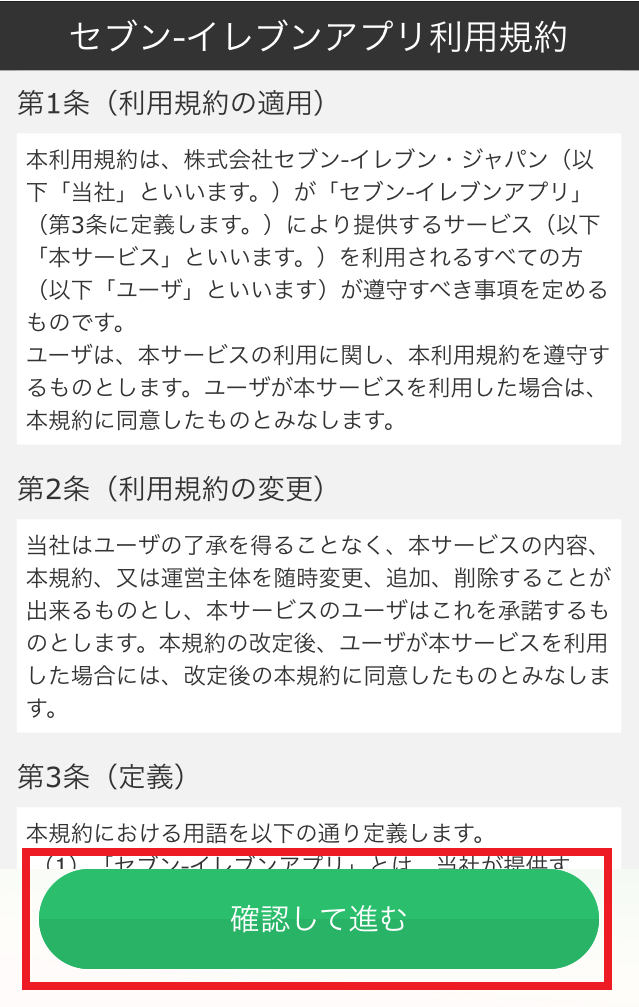 (2)アプリを開くと、利用規約が表示されます。[確認して進む]をタップします▼