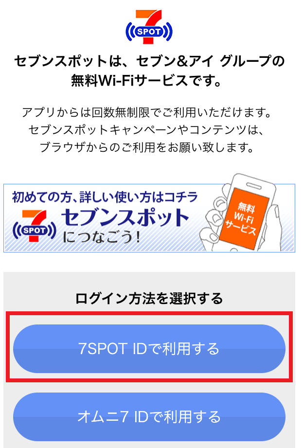 (6)「ログイン方法を選択する」から、[7SPOT IDで利用する]をタップします。