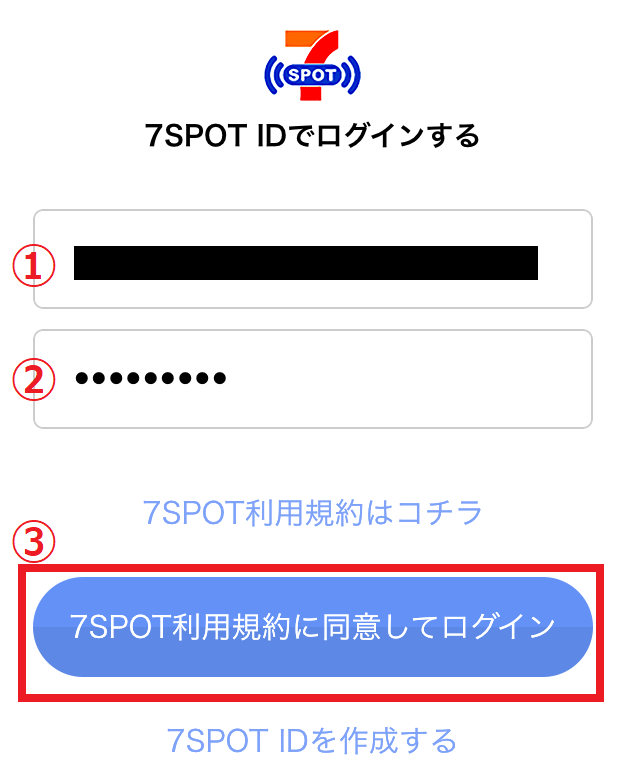 (7)セブンスポット接続画面が表示されます。「7SPOT ID(メールアドレス)」と「パスワード」を入力後、[7SPOT利用規約に同意してログイン]をタップします▼