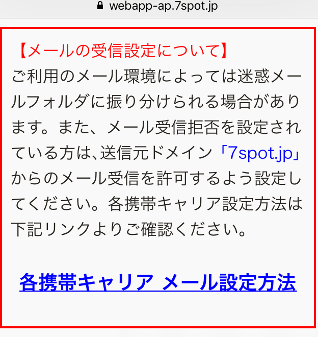 セブンスポットでも「メールの受信設定」に関して同様の注意がなされています▼