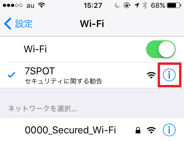 1. [設定]>[Wi-Fi]から、[7SPOT]の右にある[i]をタップ▼
