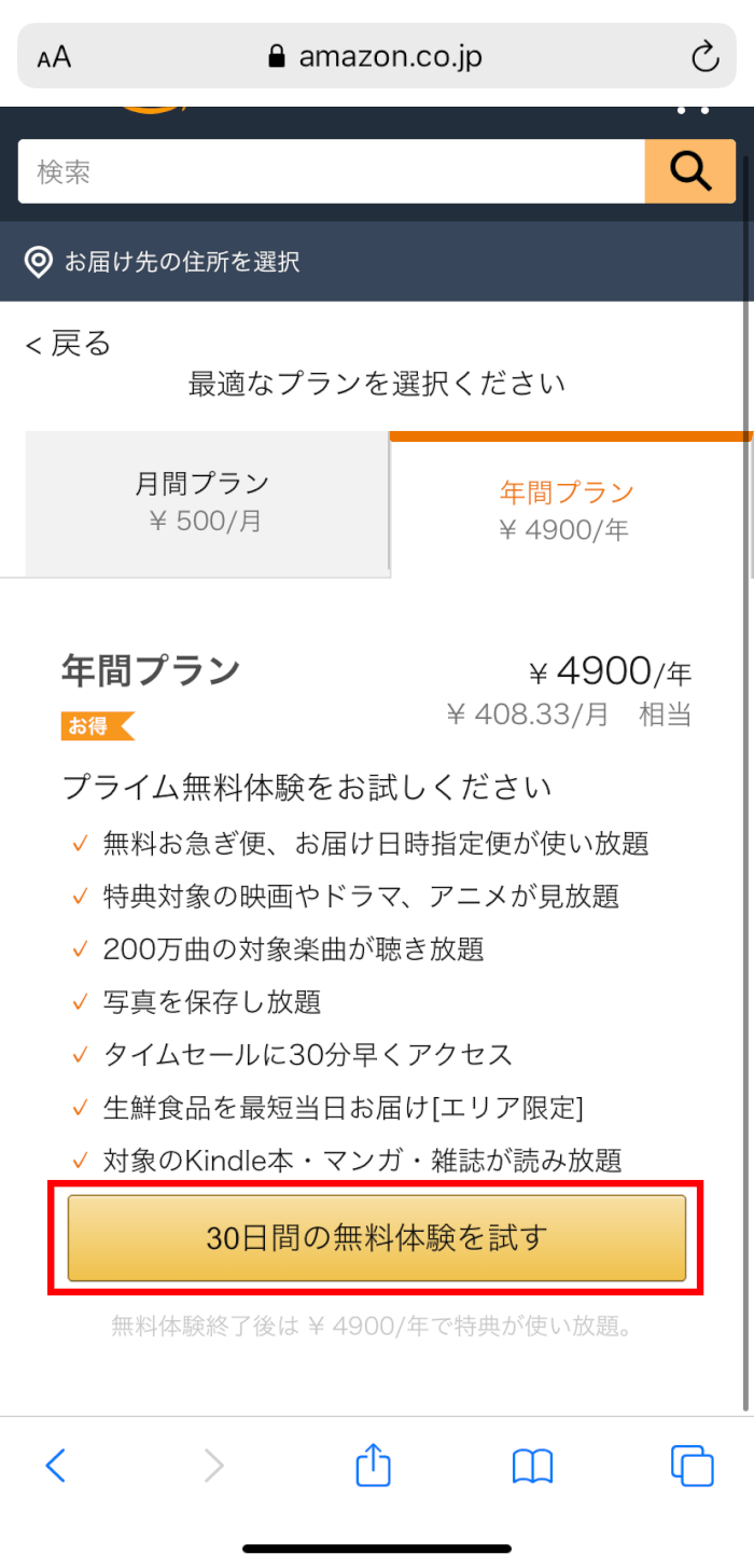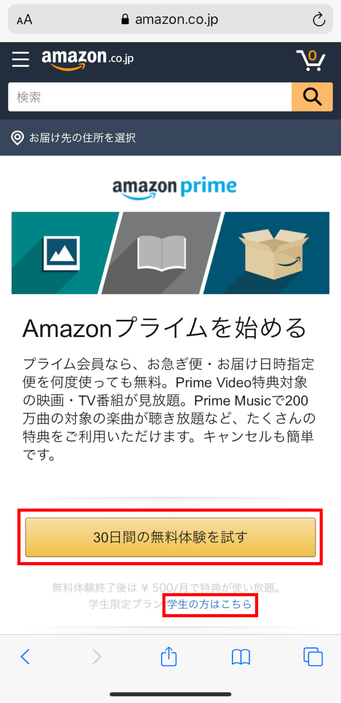 ※学生の方は「学生の方はこちら」をタップすれば「Amazon Prime Student」へ入会できます。
