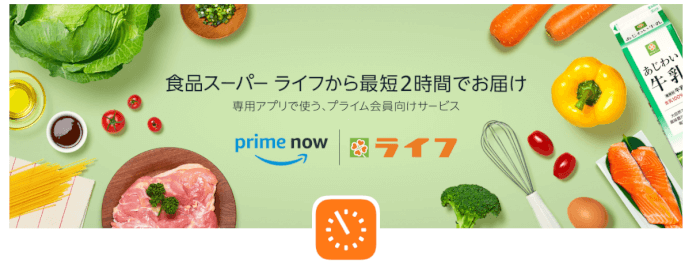 Amazon Prime Nowとは、食品スーパー「ライフ」と提携して行っている、生鮮食品や総菜等を購入できるアマゾンプライム会員限定サービスです。
