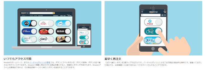 バーチャルダッシュは、よく買う商品をワンクリックで購入できるプライム会員限定のサービスです。いちいち商品検索→購入手続きをする必要が無く、ボタンを押すだけで購入できます。