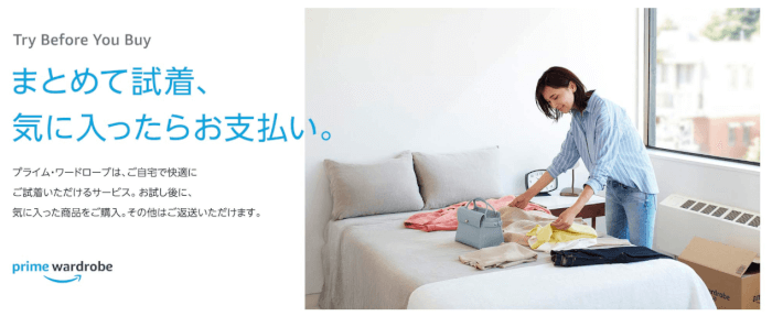 Prime Wardrobe(プライム・ワードローブ)は、服や靴・バックをまとめて取り寄せ、試着してから気に入った商品のみを購入できるプライム会員限定のサービスです。