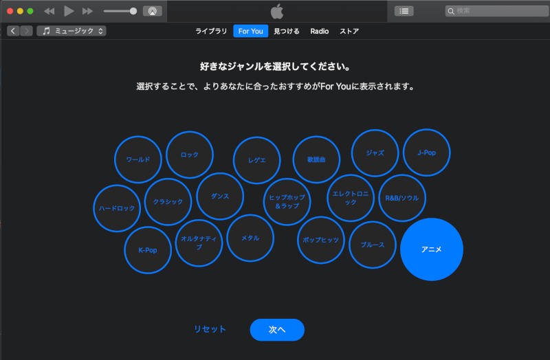 Apple Musicの無料トライアルを開始したときに、以下のような画面が出てくるので、好きなジャンルを選択しておくだけでOKです▼