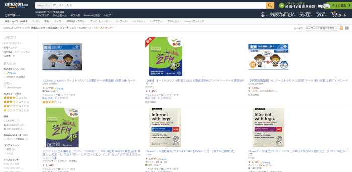 海外のSIMカードはAmazonでも購入できます。現地で購入するよりは割高ですが、日本語でマニュアルが付いているので、安心してアクティベートできます。Amazonで海外SIMの探し方は次の通りです。