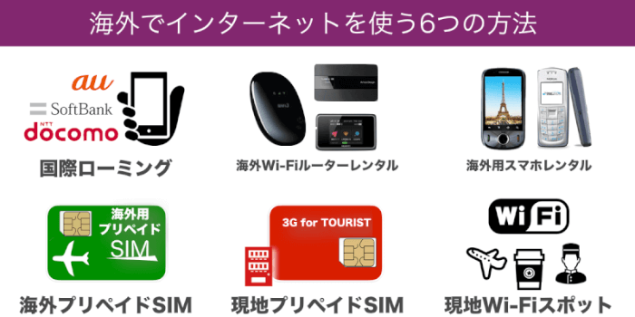 海外でスマホをネットに接続するのには、以下の6つ方法があげられます。