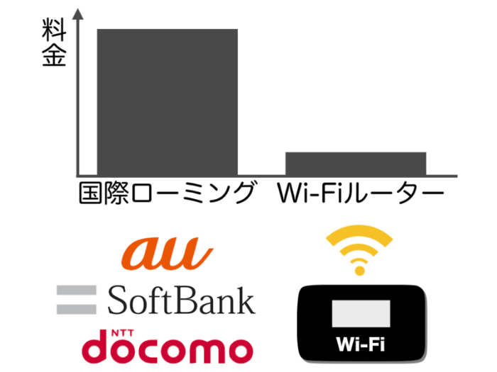 大手キャリアの場合、海外の通信設備を利用して、ネットに繋ぐ「データローミング」という機能が使えます。しかし、1日あたりの料金が980円や2,980円となっています。それに対して、海外で使えるモバイルWi-Fiルーターは、渡航先にもよりますが、1日あたりの料金が800円以下で使えることが多いので、データローミングより料金が安くなりやすいです。