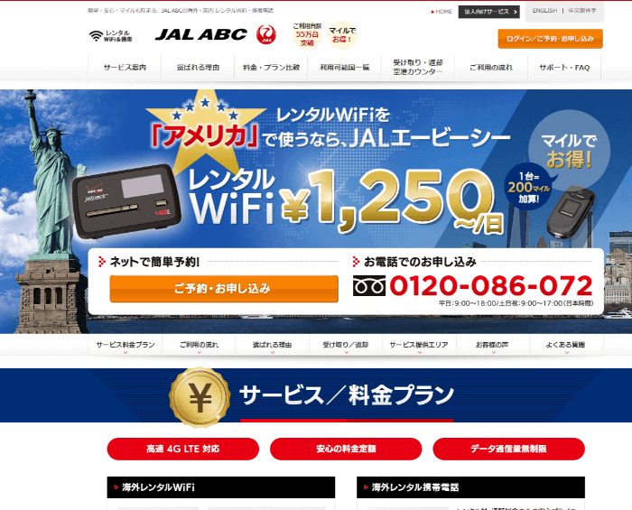 JALグループが提供しているWi-Fiルーターレンタルです。マイルが貯まるのはJALならではでしょう。通信量無制限なので、仕事で海外でもネットをバンバン使う人にとっては嬉しいです。料金は他社に比べて、1,150円/1日と割高ですが、受渡手数料などはかかりません。