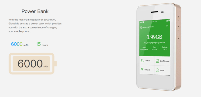 GlocalMe G2は、購入型モバイルWi-Fiルーターの代表選手的な端末です。6000mAHの大容量バッテリーを備えており、約15時間の利用ができます。さらに、モバイルバッテリーとしても使えます。