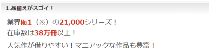 漫画のレンタル料金に関して、公式サイトには記載がありません。ツタヤ同様、いくつかの店舗に電話して確認してみましたが、店舗によって料金やプラン設定が全然違いました。こちらもいくつかの店舗を回って、一番安い店を探してみてもいいかもしれません。