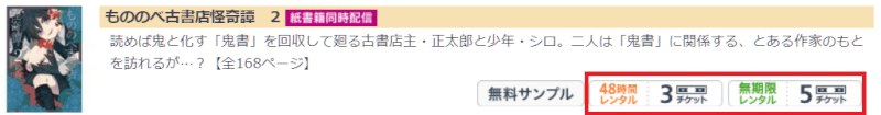 レンタルの種類には2種類あり、「48時間レンタル」と「無期限レンタル(購入)」です。48時間レンタルの方が安価で借りられますが、レンタル中であれば、無期限レンタルとの差額チケットを払うことで、無期限レンタルにアップグレードすることも可能です。だいたい48時間レンタルが1~3チケット(100~300円)、無期限レンタルが2~6チケット(200~600円)必要になります。