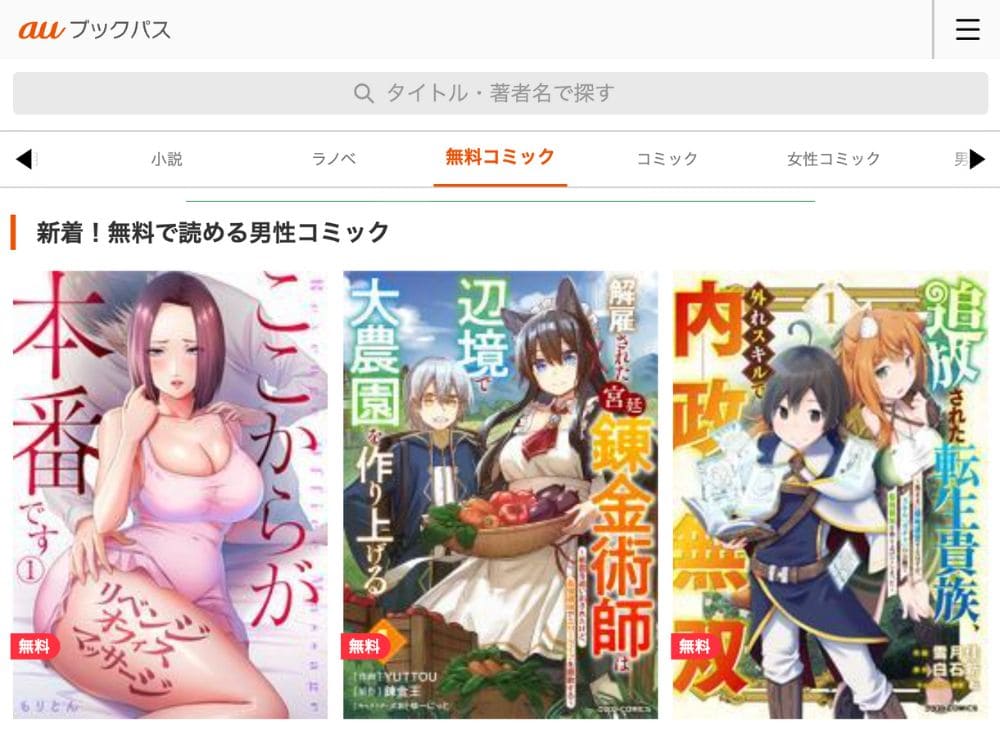 | auブックパス | 完全無料(月額コースあり) | 常に無料で読める | 40,820冊 | 53,620冊 | 43,170冊 | 2,122冊 |