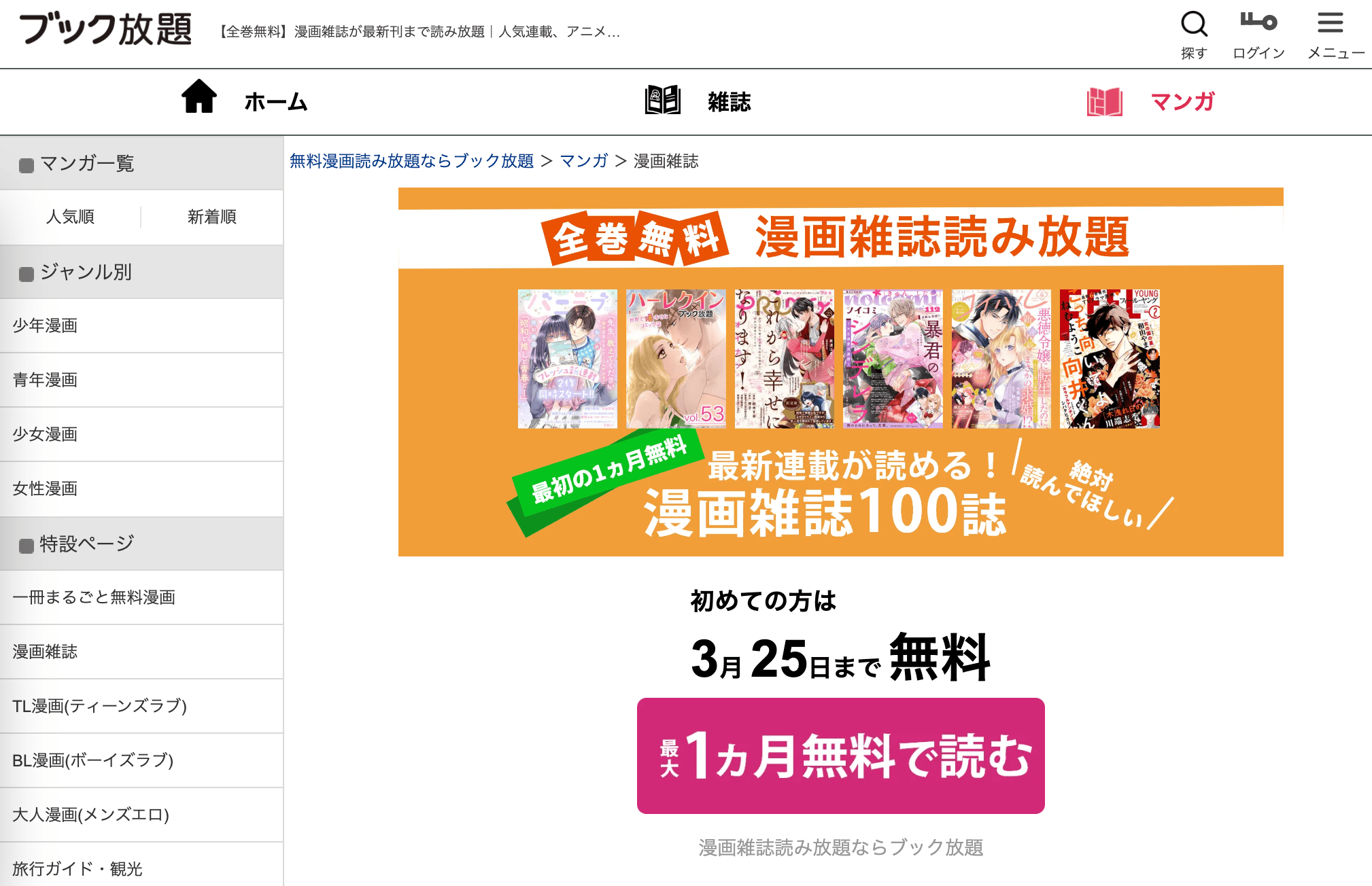 19年以上前から運営されている漫画読み放題サービスの老舗です。2つの有料サービスが用意されています。成人向けのコミックが多いのが特徴的です。