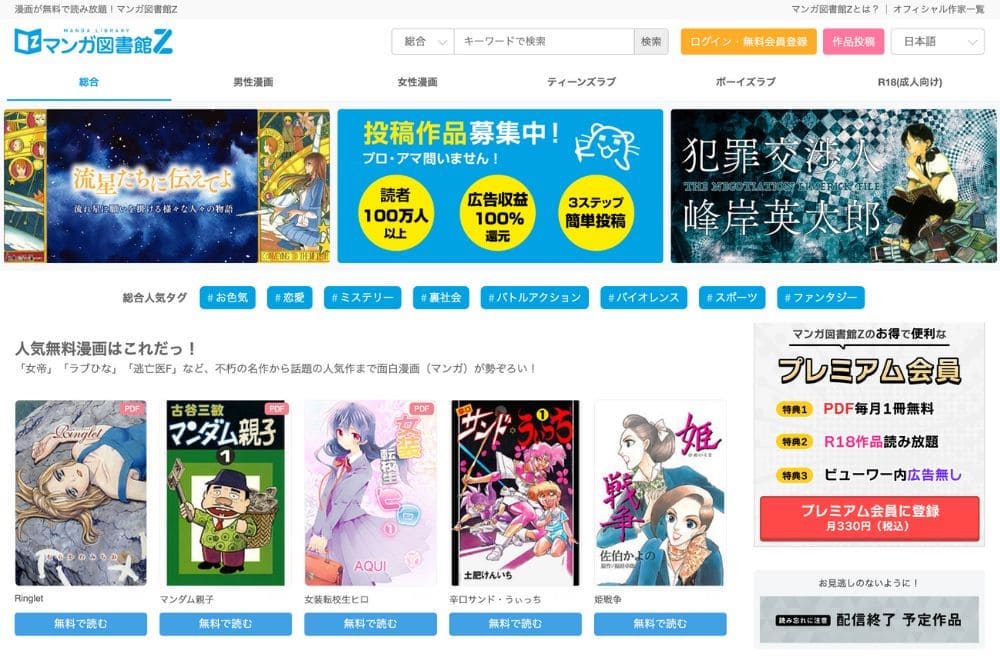 漫画図書館Zはプロだけでなく、漫画家の卵のアマチュアの作品も読めます。無料の理由は広告を表示させることで収益を出しているため、広告は出ますが、無料会員でもそこそこ漫画が読めます。
