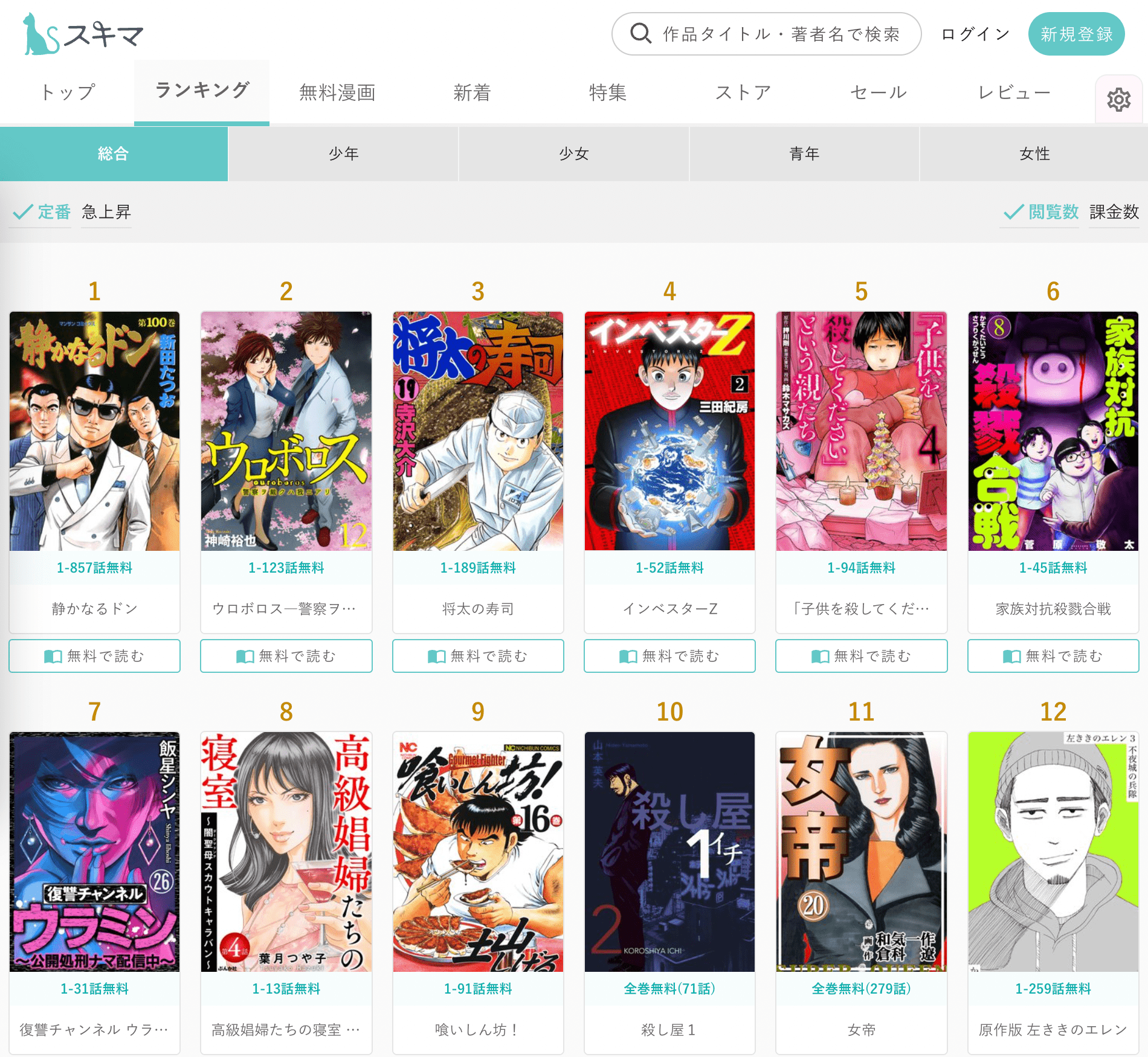 「スキマ」や「漫画図書館Z」などが完全無料型です。