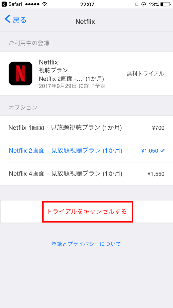 ⑥iPhone本体の設定に飛ばされます。「(トライアルを)キャンセルする」をタップ▼