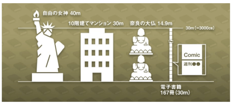 電子書籍ならページ数が多い本でも、重さがないので、持ち運びに便利です。1万冊買ったとしても場所を取らないので、「ちょっとした本屋が開けるのではないか?」というくらい本を買う人には快適ですよ。