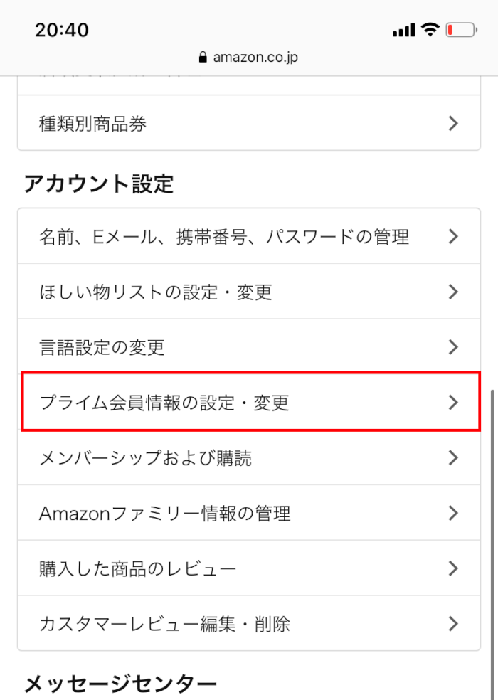 少し下にスクロールし、「アカウント設定」内の「プライム会員情報の設定・変更」をタップ▼