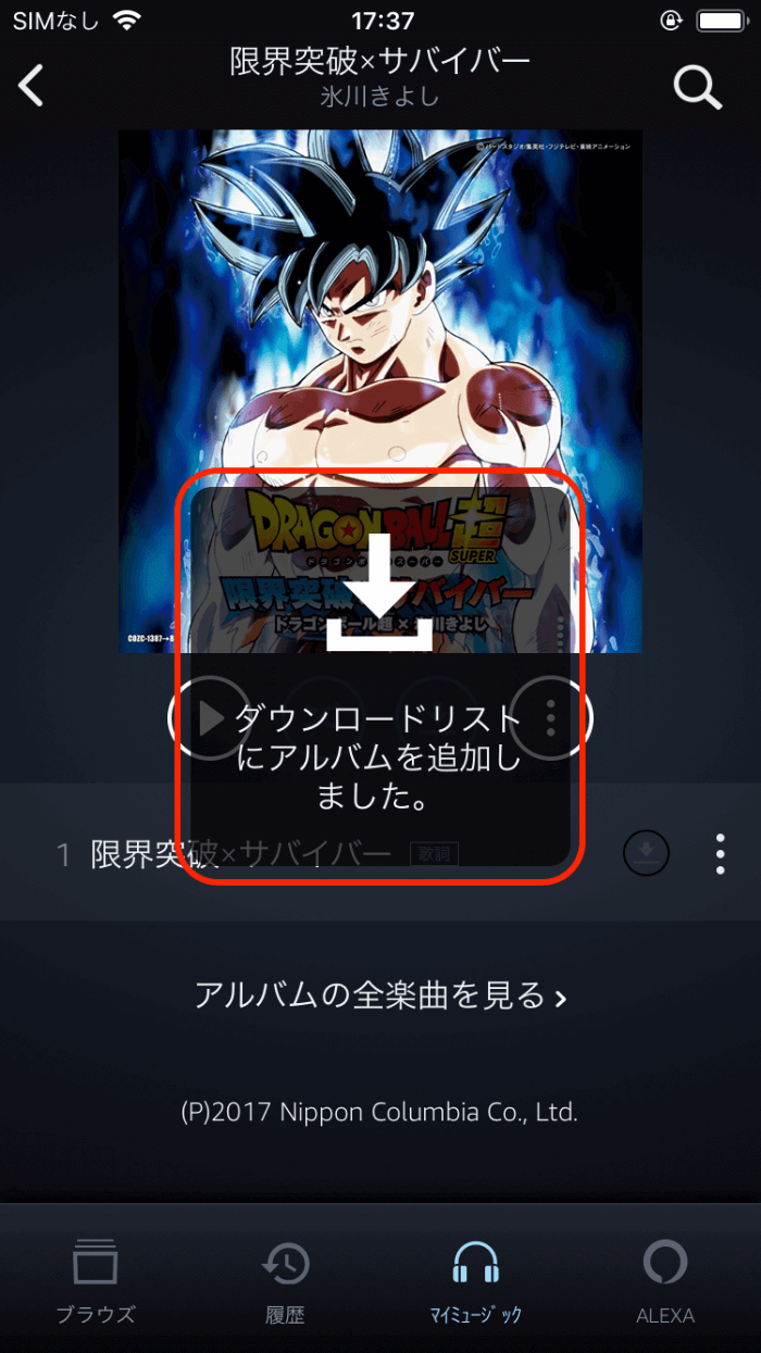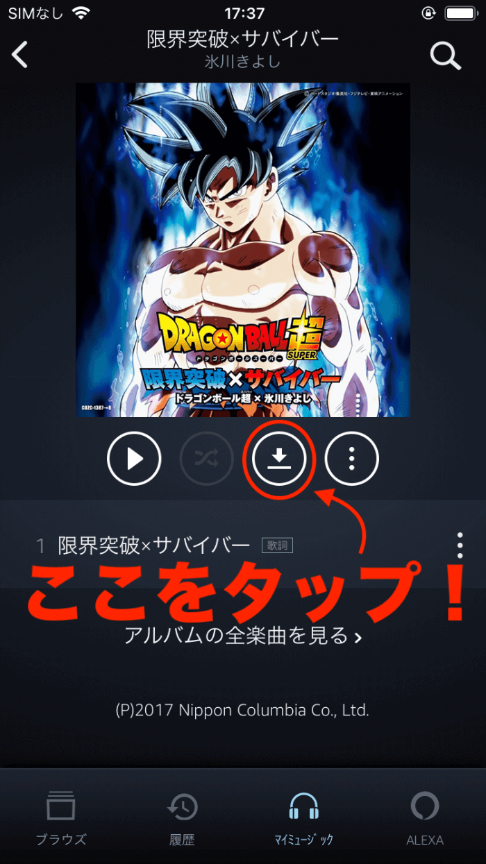 使い方はカンタンです。楽曲の再生中に[ダウンロードマーク]をタップします▼
