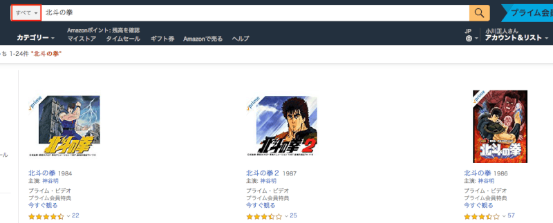 例えば、『北斗の拳』の動画をプライム・ビデオで探す場合、Amazonの検索窓に『北斗の拳』と入力して検索すれば動画が見つかります。商品カテゴリー(画像の赤枠)を変更する必要はありません▼