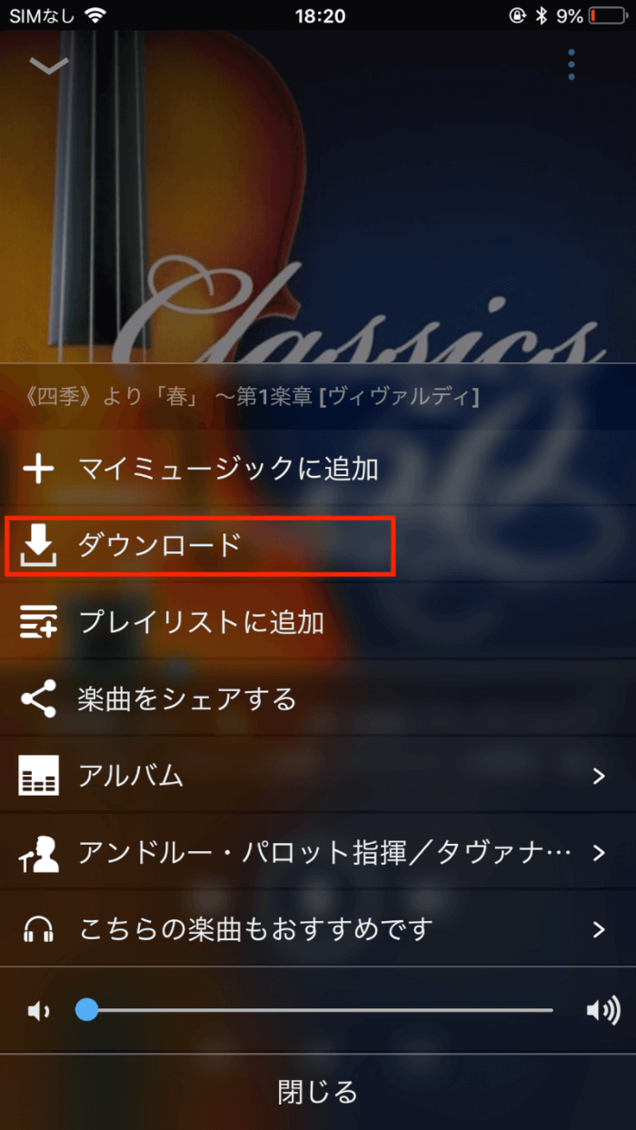 ②するとメニューが開くので、その中から[ダウンロード]を選択します。あとは楽曲がダウンロードされて端末に保存されます▼