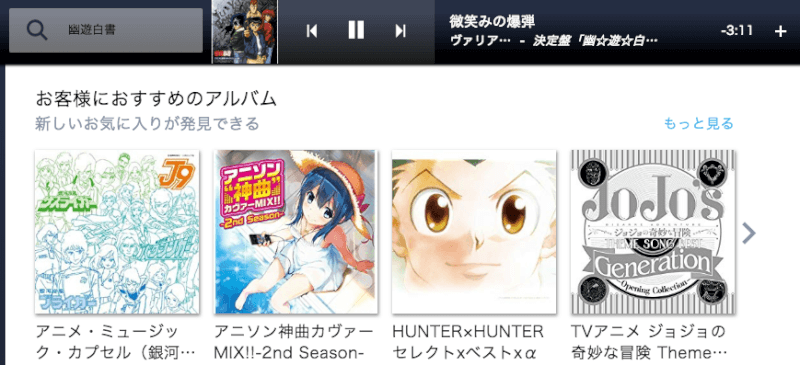 例えば、『幽☆遊☆白書』の曲を再生すると、同じような系統のアニメソングを紹介してくれます▼