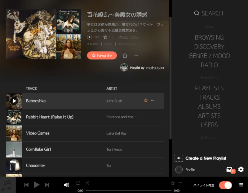 ただし、ハイライト再生は、無料プランで聴ける範囲での再生になる為、自分の好きなところを指定できません。ここが調整できるようになると、プレイリストを作成する面白さも広がるので、指定できるようになって欲しいと感じました。