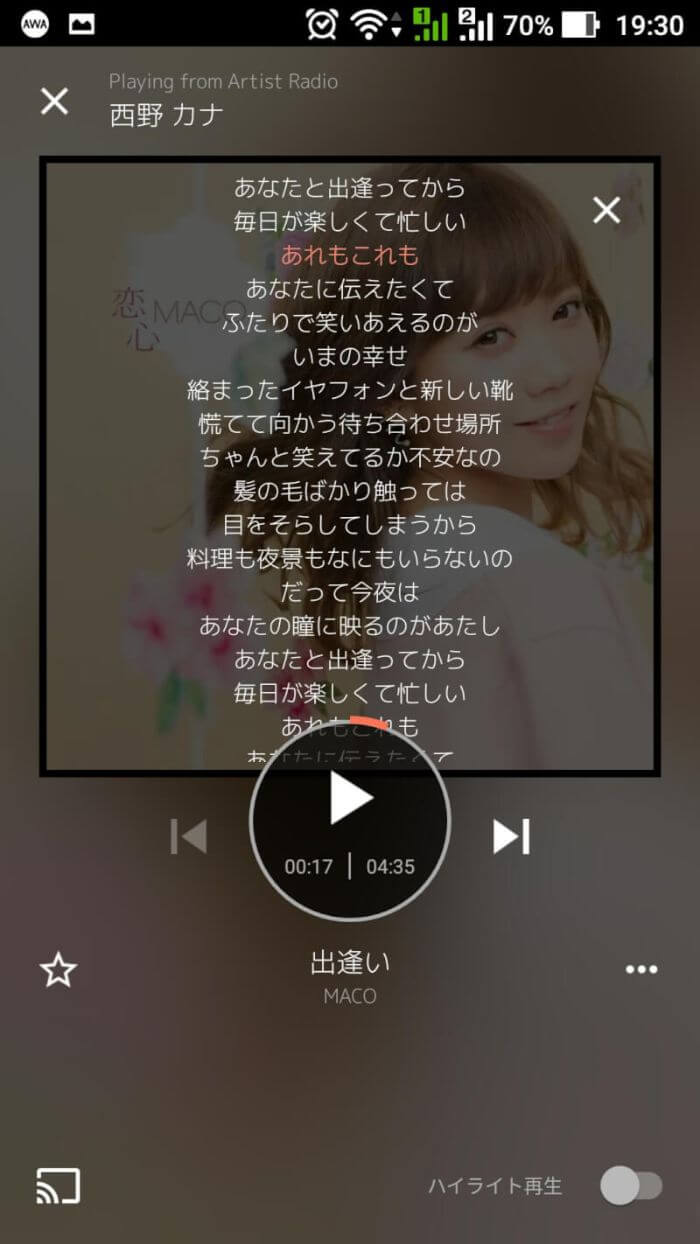 他社のサービスでは、画面の歌詞に変化がないですが、AWAの場合は曲の進行に歌詞が色づいていくので、今どこまで歌っているのかを把握しやすいです。見た目にもカッコいいです。