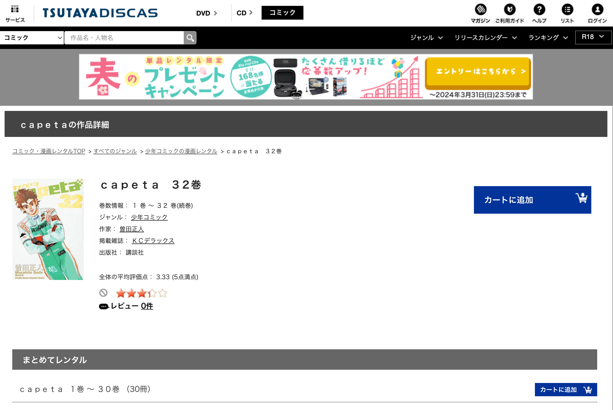 レンタルで一度読んでみて、気に入ったら購入するという方法も可能です。ただし、TSUTAYAディスカスは最大30巻まで一度に借りられるので、カペタの場合は2回に分ける必要があります。