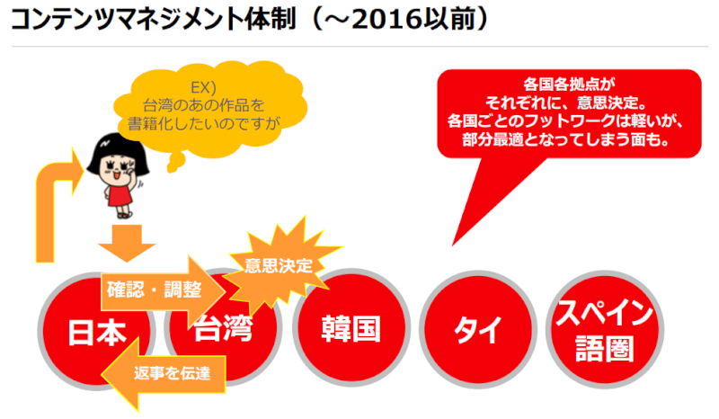例えば、台湾で「ある作品」を単行本化したいといった相談があったとします。以前は、台湾comicoがどうするかを決める場合もあったり、日本側に確認する事もあったりと、意思決定の経路が確立されていませんでした。ですので、その都度、日本と台湾で「進め方を決める」という事にもエネルギーと時間が使われ、結果的にロスが生じてしまっていました。