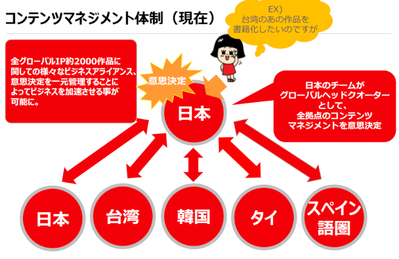そこで、本年より世界中のコンテンツをマネジメントする「グローバルヘッドクォーターチーム」を日本に置くことで、全体最適に図りました。世界中の全作品に関する意思決定を一元管理することで、それまで起きていたような各国での間のロスをなくしました。世界規模でのコンテンツマネジメント体制を変えることで、海外展開を加速させることができたのではないかと考えています。