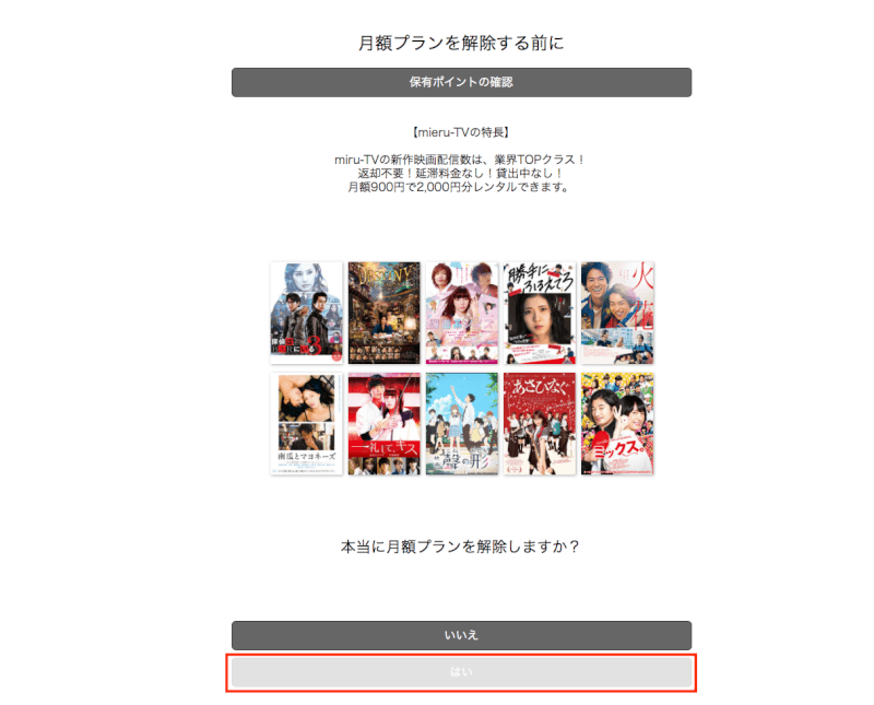 ②解約を呼び止める画面が出てきますが、その下の[はい]をクリック▼
