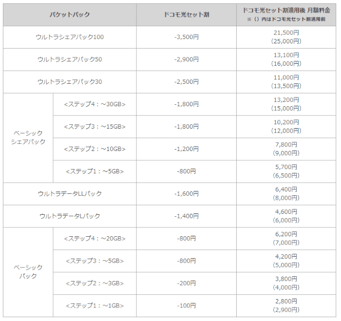 またドコモのスマホを家族全員で使い、シェアパックプランの大容量を契約している場合、割引額が非常に大きくフレッツ光よりもかなり安くなることも見て取れます。