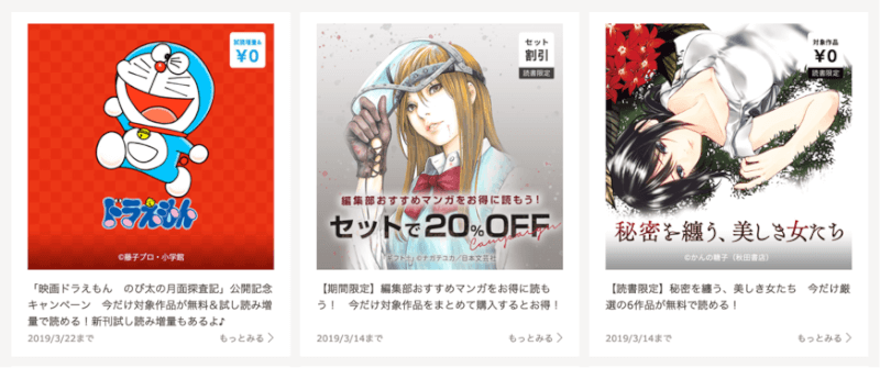 他にも、「一部の巻が無料公開」という太っ腹なキャンペーンも実施しているので、キャンペーンは、ときどきチェックしてみるといいですよ。