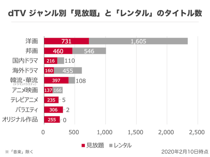 ※dTVの動画は上記複数カテゴリに跨っている動画もあるので、合計しても5,700タイトルから少しずれます。特に洋画とアニメ映画は結構被っています。また、これらの作品タイトル数やラインナップは2020年2月10日に集計したのもです。作品は日々変化しているので、最新のタイトルはご自身で直接ご確認ください。