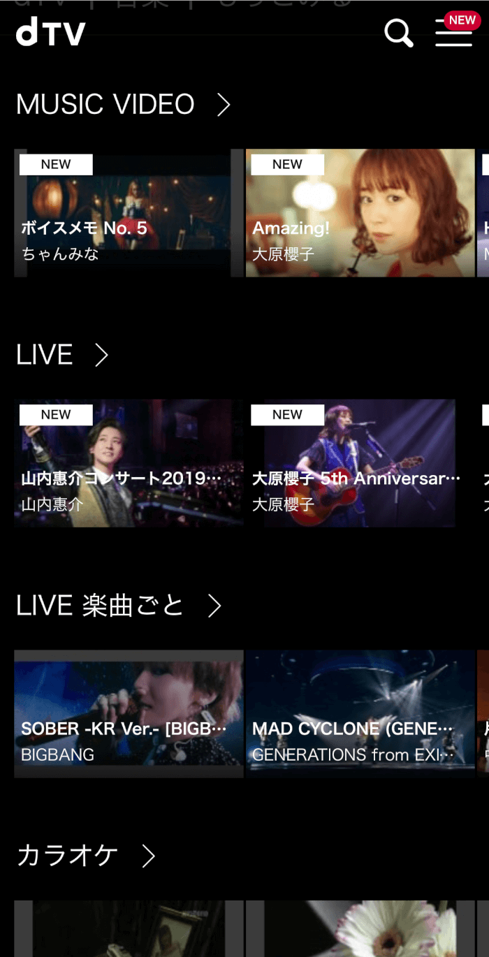 dTVのジャンル「音楽」では、カラオケや各歌手のMV(ミュージックビデオ)やLIVE映像などが豊富にそろっています▼