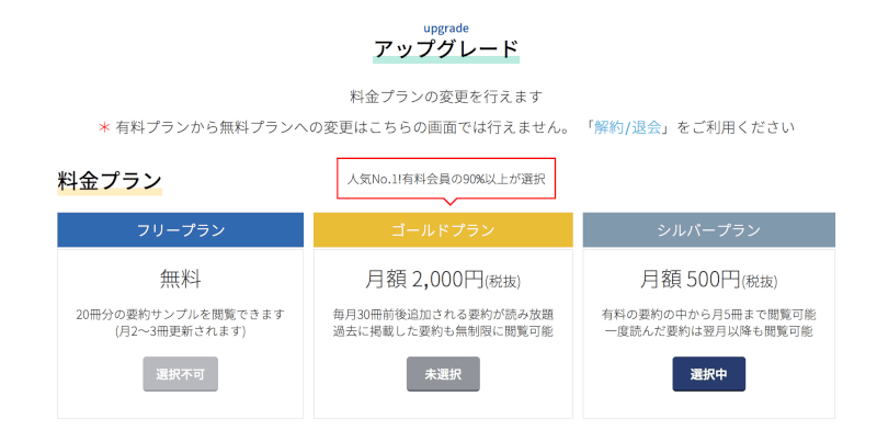シルバープランは、月に読める要約の数が無料の20冊に加えて5冊だけなので、1時間と経たずに読める本の上限に達してしまう可能性があります。契約するなら、無制限で要約が読めるゴールドプランがおススメです▼