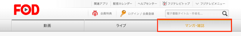 ②ログイン後、サイトの上の方にある[漫画・雑誌]タブをクリック▼