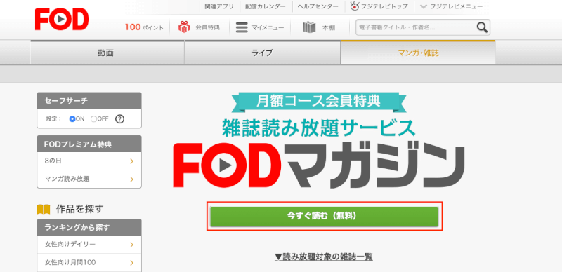 ④雑誌読み放題のFODマガジンページに飛ぶので、[今すぐ読む(無料)]をクリックします。